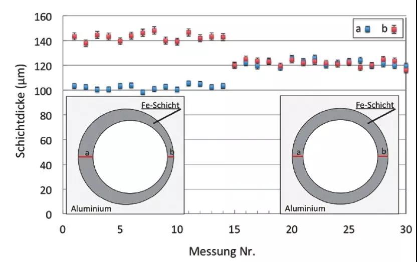 在工藝早期測(cè)量涂層厚度,可以省去增值鏈中的任何后續(xù)處理步驟,例如涂層厚度過低。對(duì)于粗糙的噴涂表面,傳統(tǒng)涂層厚度測(cè)量儀器具有低重復(fù)精度,因此不適合質(zhì)量保證。通過顯微照片進(jìn)行隨機(jī)檢查是非常耗時(shí)的,并且不允許對(duì)涂層工藝進(jìn)行無縫且無損的檢查。相反,Winterthur公司的設(shè)備CoatMaster可測(cè)量表面1-3毫米的直徑的區(qū)域得出涂層厚度。結(jié)果顯示,即使在高粗糙度下,也實(shí)現(xiàn)了1至2%的高重復(fù)精度,測(cè)量時(shí)間少于一秒。因此,在批量生產(chǎn)中也可以測(cè)試每個(gè)孔的多個(gè)測(cè)量點(diǎn)。