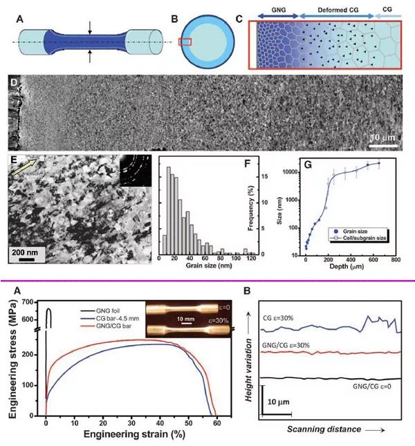 圖3 硬化速率上升以及額外的應(yīng)變硬化. A 工程應(yīng)力應(yīng)變曲線,應(yīng)變速率為5*10-4s-1.CG代表均勻的粗晶樣品;GS:代表梯度層,厚度約為120 μm:GS–CG:厚度為1mm的梯度-粗晶樣品。NS:納米金屬樣品. GS–CG+:在應(yīng)變分別為0.05, 0.1, 0.15, 和 0.2的加載-卸載樣品. B 應(yīng)變硬化速率-真應(yīng)變曲線;C維氏顯微硬度(H) vs深度曲線;(D)不同拉伸應(yīng)變后δ H (H增量)vs深度的曲線。