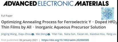 采用全無機(jī)鹽水溶液前驅(qū)體,通過化學(xué)溶液沉積法在Si(100)襯底上制備了10 nm厚的摻Y(jié) -HfO2薄膜。并研究了退火工藝(包括退火溫度,保溫時間和加熱速率)對薄膜的晶體結(jié)構(gòu)和鐵電性的影響。實(shí)驗(yàn)結(jié)果表明,薄膜的晶體結(jié)構(gòu)和鐵電性能同退火過程密切相關(guān)。此外,薄膜中共存單斜和不對稱的正交相。最優(yōu)鐵電性的退火工藝為:在N2氣氛中以30 °C?s-1的加熱速率在700 °C下退火30 s。 從而實(shí)現(xiàn)了薄膜的m相占比低至17.9%,并且具有最高的剩余極化強(qiáng)度(21.4 μC ?cm-2)。