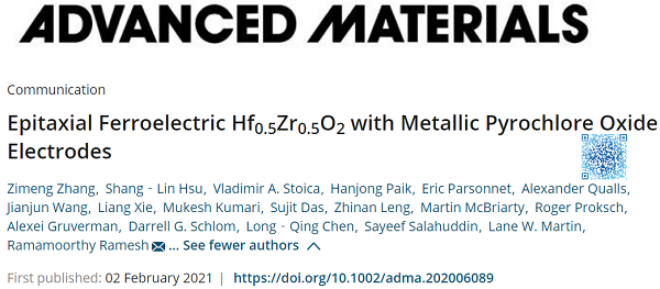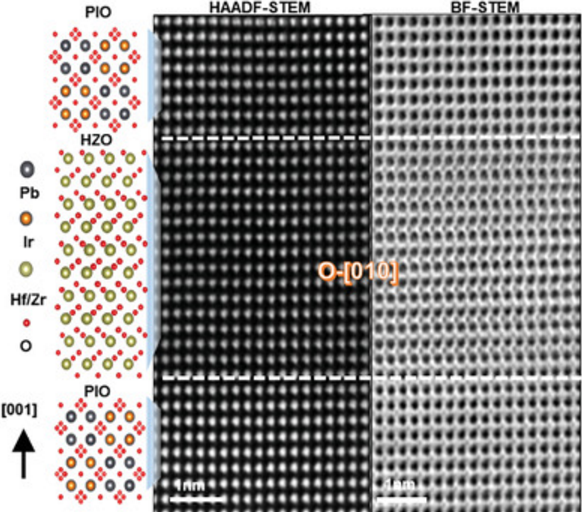 通過使用導(dǎo)電燒綠石氧化物電極作為結(jié)構(gòu)和化學(xué)模板來合成全外延鐵電Hf0.5Zr0.5O2(HZO)薄膜。以Pb2Ir2O7(PIO)和Bi2Ru2O7(BRO)為例,這些燒綠石表現(xiàn)出金屬導(dǎo)電性,其室溫電阻率<1 mΩ?cm,并且與氧化釔穩(wěn)定的氧化鋯襯底以及在其頂部生長的HZO層實(shí)現(xiàn)了緊密的晶格匹配。通過XRD和STEM確定了外延和疇形成的證據(jù),這些證據(jù)表明HZO薄膜的c軸垂直于襯底表面。當(dāng)HZO膜厚度大于等于約30 nm時,可以觀察到從極性正交晶相中出現(xiàn)了非極性單斜相。熱力學(xué)分析揭示了外延應(yīng)變和表面能在穩(wěn)定極性相以及膜厚變化時共存非極性單斜相中的作用。