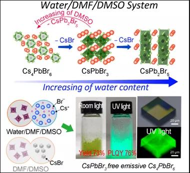 深圳大學(xué)微納光電子學(xué)研究院時玉萌課題組報道了水-DMF-DMSO三溶劑體系制備高質(zhì)量銫鉛溴鈣鈦礦的方法。該方法解決了強離子性的Cs離子在DMF/DMSO中難以溶解的問題。該方法可以不經(jīng)歷CsPbBr3中間相,而直接獲得高質(zhì)量的Cs4PbBr6熒光晶體,解決了傳統(tǒng)方法中Cs4PbBr6熒光晶體中內(nèi)嵌CsPbBr3納米晶的問題。所制備的Cs4PbBr6鈣鈦礦晶體的熒光產(chǎn)率達(dá)到76%,呈現(xiàn)出典型的幾何形狀依賴的熒光行為,與量子點的點狀熒光存在明顯的區(qū)別,明確了其綠色熒光更有可能來源于的Br-缺陷。