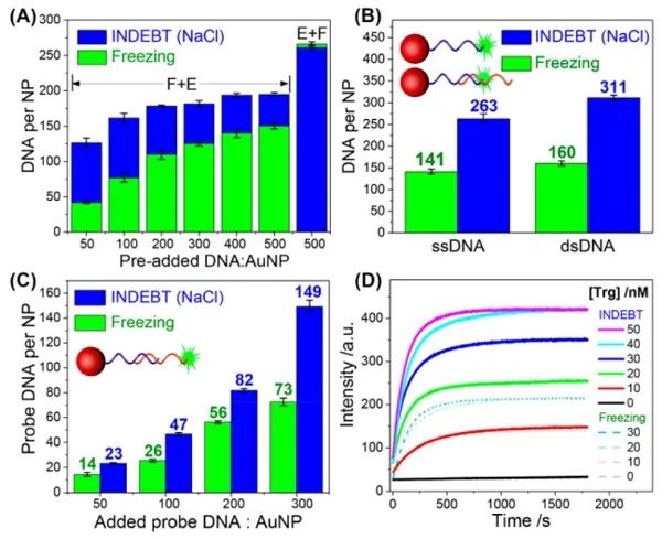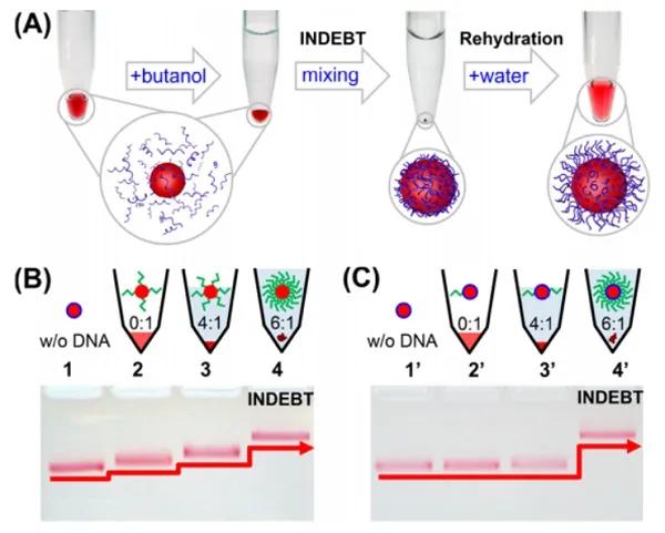 (B-C)凝膠電泳結(jié)果顯示,隨丁醇:H2O體積比增加,檸檬酸鹽(B)和磺化三苯基膦(C)保護的15 nm AuNP表面DNA修飾量先緩慢增加(B)或幾乎不變(C),發(fā)生脫水(INDEBT)時DNA接枝量急劇增加。