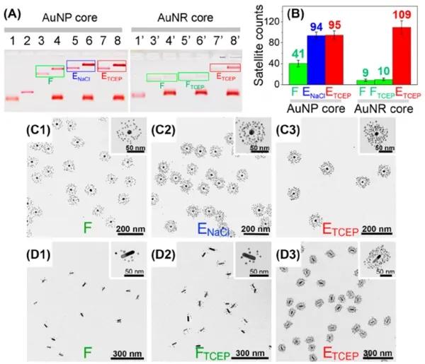 (C-D)以冷凍和INDEBT制備的DNA功能化AuNP和AuNR(金納米棒)為核組裝得到的核-衛(wèi)星結(jié)構(gòu)TEM圖像。