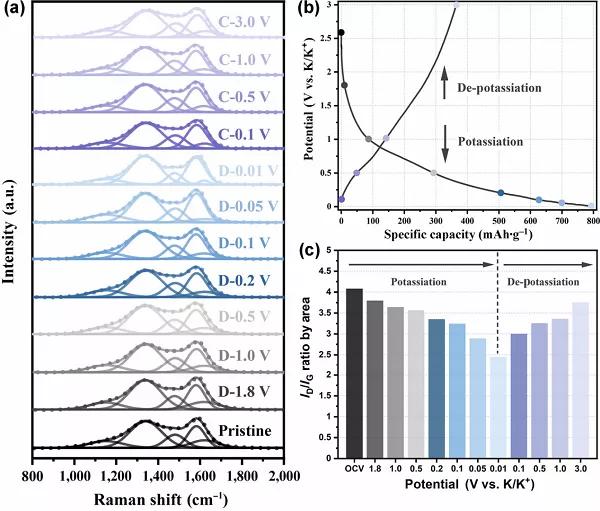 (a) K離子嵌入碳層間并形成穩(wěn)定的KC8化合物的示意圖;