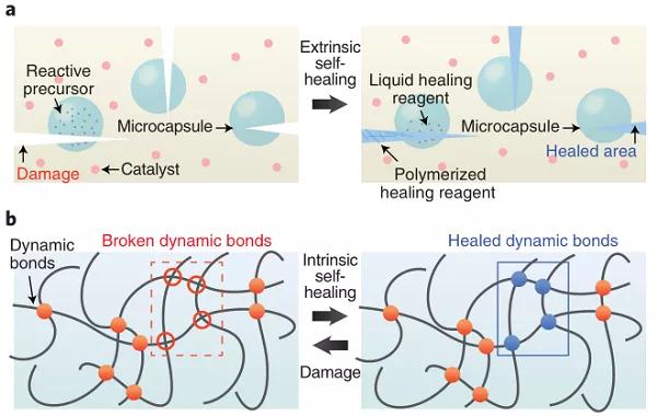 自修復材料可大致分為兩類:外源型(圖1a)和內(nèi)源型(圖1b)。當分散的愈合劑(通常由聚合物基質(zhì)中的反應(yīng)性前驅(qū)物和催化劑組成)在損傷后釋放時,會發(fā)生外源型自修復。這些愈合劑可以通過自主聚合反應(yīng)和交聯(lián)網(wǎng)絡(luò)的重建來修復損傷區(qū)域。盡管這種方法非常可靠,但它只允許材料有限次數(shù)愈合,而且通常不能在相同的位置重復愈合。相比之下,內(nèi)源型自修復材料不需要添加愈合劑,并且受損區(qū)域能夠通過聚合物基質(zhì)的重組重復愈合。此過程是通過動態(tài)共價鍵或非共價鍵的再生以及受損界面上聚合物鏈的纏繞重建了基體。