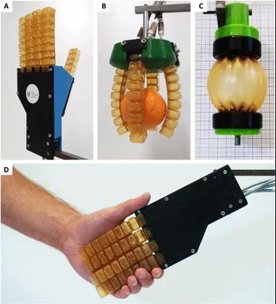 圖5. 軟氣動執(zhí)行器。(A和D)自修復軟氣動手。 (B)自修復軟氣動抓手。 (C)自修復等褶狀氣動人工肌肉。