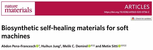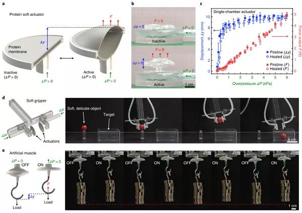 當前的自修復材料具有限制其實際應(yīng)用的缺點,例如低的治療強度(低于兆帕)和長的治療時間(小時)。 針對這個問題德國馬普研究所的Melik C. Demirel和來自美國賓州州立大學的Metin Sitti團隊基于魷魚腕足吸盤中的環(huán)狀齒蛋白序列,通過蛋白質(zhì)工程技術(shù),成功制備出了兼具高愈合后強度、超快愈合速度(愈合后強度達到2-23 MPa,愈合時間1s)和生物可降解的自愈合彈性體材料,并將這種材料用于制備氣動人工肌肉和柔性抓手。這種材料可以在一秒鐘內(nèi)通過局部加熱自我修復微觀和宏觀機械損傷。并且經(jīng)過系統(tǒng)優(yōu)化,可以改善其氫鍵結(jié)合的納米結(jié)構(gòu)和網(wǎng)絡(luò)形態(tài),具有可編程的愈合特性,超過其他天然和合成軟材料的數(shù)量級。