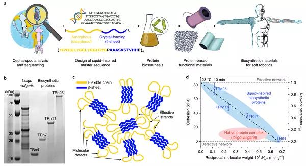 圖 7. 蛋白鏈結(jié)構(gòu)及其高級折疊結(jié)構(gòu)。魷魚蛋白質(zhì)的分析,魷魚啟發(fā)的主序列的設(shè)計以及蛋白質(zhì)庫的生物合成,產(chǎn)生了基于蛋白質(zhì)的功能性自修復材料,適用于軟促動器和機器人應(yīng)用。b,天然Loligo vulgaris蛋白復合物和生物合成TRn4,TRn7,TRn11和TRn25多肽的蛋白大小。c,生物合成串聯(lián)重復多肽的納米結(jié)構(gòu)由通過柔性鏈(黃色)連接的β-片狀納米晶體網(wǎng)絡(luò)(藍色)組成,具有分子缺陷(懸空的末端和環(huán))。d,由于優(yōu)化的網(wǎng)絡(luò)形態(tài),魷魚啟發(fā)的蛋白質(zhì)(在室溫下)的自愈特性比天然蛋白質(zhì)得到的改善。誤差線,標準偏差(n = 5)。