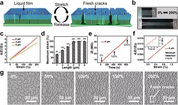 電阻應(yīng)變傳感器具有出色的靈敏度和順應(yīng)性,因此在柔性和可拉伸電子產(chǎn)品的開發(fā)中起著至關(guān)重要的作用。然而,由于固體導電層與聚合物之間的低粘合強度以及常規(guī)固體導電層內(nèi)部不可彌補的干摩擦,這種傳感器的耐用性較差。針對該問題,中國科學院理化技術(shù)研究所生物啟發(fā)智能界面科學實驗室田野團隊受動物角膜淚膜的結(jié)構(gòu)和出色的耐磨性的啟發(fā),設(shè)計了基于由改性聚二甲基硅氧烷(PDMS)制成的仿生微絨毛上形成的均勻自修復無磨損液態(tài)膜的超耐久應(yīng)變傳感器。將包含離子液體的乙醇溶液添加到PDMS微絨毛中,由于表面化學性質(zhì)和特殊結(jié)構(gòu),該微絨毛具有超親液性。在蒸發(fā)過程中,離子液體通過壓力向上驅(qū)動,并形成連續(xù)的導電膜。作為傳感層,當反復拉伸和釋放時,由于濕摩擦而使毛細管穩(wěn)定化的液膜無損,并且在釋放后,由于毛細管力引起的自我修復能力,裂縫將完全恢復,從而使應(yīng)變傳感器能夠具有超過22500個裝卸循環(huán)的高耐久性。這項工作提出了一種構(gòu)建超耐用電子產(chǎn)品的方法。