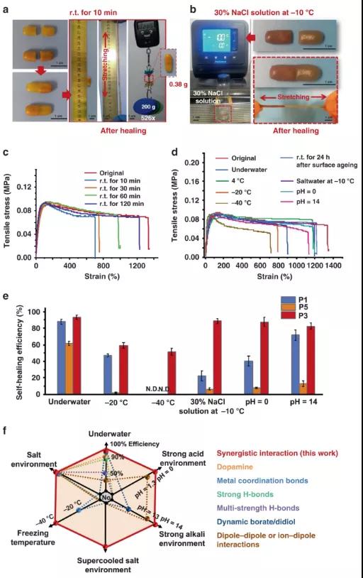 皮膚和肌肉在受到損傷時會自動自我修復,而這一能力一直是科學家夢寐以求想賦予材料的一種特殊性能。然而,目前的可修復材料的大多數(shù)設(shè)計都需要外部能量才能愈合或者這些材料的機械強度較弱。動態(tài)超分子材料可以在一定程度上解決以上問題,它在室溫下無需外部條件便可以發(fā)生自我修復。但是,具有自修復性能的動態(tài)超分子材料往往不能適用于極端條件,原因在于:(i)當可修復材料在水下受傷或破裂時,水分子會干擾動態(tài)鍵的重新連接,導致材料無法修復。(ii)在凍結(jié)條件下,可修復材料中鍵的動態(tài)特性遇到很大的障礙,從而極大地限制了自修復過程。(iii)一些自我修復的相互作用易受pH值變化的影響。針對以上問題,來自天津大學化工學院張雷教授團隊,通過在聚二甲基硅氧烷聚合物中協(xié)同結(jié)合多強度氫鍵和二硫鍵交換,設(shè)計出一種具有普遍自愈性和高拉伸性的超分子彈性體。它可以在極端條件下實現(xiàn)快速的自主自修復,包括在室溫、超低溫(?40°C)、水下、過冷的高濃度鹽水(-10°C下30%NaCl溶液中)和強酸/堿環(huán)境(pH=0或14)。這些性質(zhì)歸因于動態(tài)強氫鍵和弱氫鍵與強二硫鍵的協(xié)同相互作用。