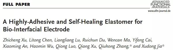 柔性可拉伸電極在可穿戴電子領(lǐng)域中具有廣泛的應(yīng)用。近年來,隨著醫(yī)療器械的發(fā)展,人們對可拉伸電極材料的功能性要求也越來越高。如用于監(jiān)測生物電信號的電極材料不僅需要優(yōu)異的彈性和導電性,還需要和生物界面具有優(yōu)異的粘附性來保證信號的穩(wěn)定性。目前所采用的電極所采用的基體材料通常采用硅橡膠類彈性體,這類聚合物在具有高彈性的時候并不能具備粘附性。因此制備一種本身具有粘性的彈性體具有重要的意義。針對這一問題,南京大學化學化工學院張秋紅副教授、賈敘東教授課題組將帶有二羥基的多巴胺基團引入到以聚四氫呋喃醚基聚氨酯體系中,利用體系內(nèi)的動態(tài)氫鍵和多巴胺間相互作用,制備了一種新型的“粘”彈體(斷裂形變5100%,斷裂強度1.9 MPa,粘附強度62 kPa)。