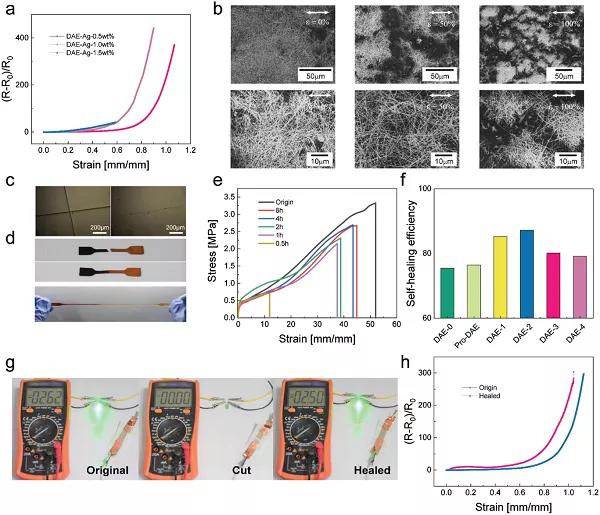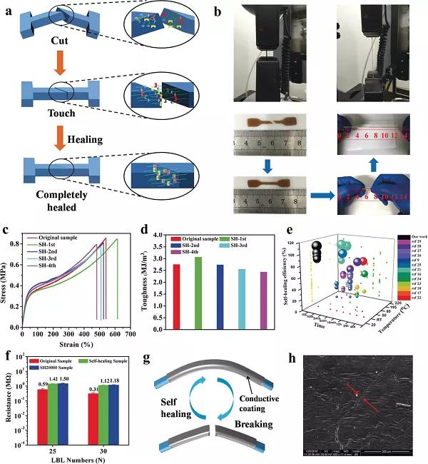圖13. 自修復性能測試。a)自我修復過程。b)拉伸前后自我修復的多氫鍵彈性體的照片。c)原始,第一,第二,第三和第四愈合的多氫鍵彈性體的典型應(yīng)力-應(yīng)變曲線和d)韌性。e)比較不同自修復聚合物彈性體的機械自修復效率。f)25和30 LBL循環(huán)的應(yīng)變傳感器的電氣自修復性能。g)電氣自我修復過程。h)帶有25個LBL循環(huán)的已修復傳感器的SEM圖像。