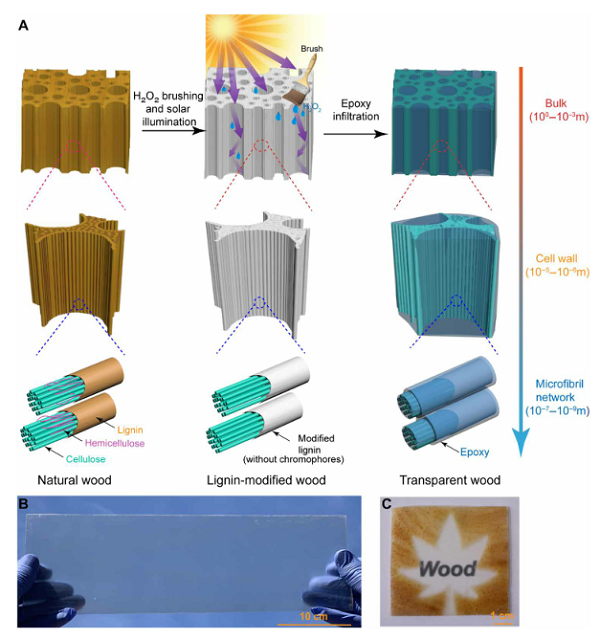 Solar-assisted fabrication of large-scale, patternable transparent wood