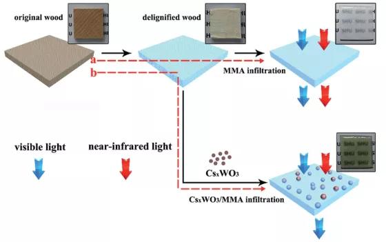 Transparent wood containing CsxWO3 nanoparticles for heat-shielding window applications