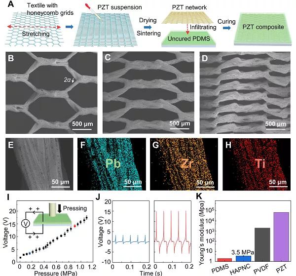 圖2. A 柔性壓電復(fù)合材料的制備示意圖。B-D 不同預(yù)拉伸的壓電陶瓷骨架電鏡圖。E-H 陶瓷骨架能譜圖。I-J不同壓力下的電壓輸出。K 不同材料的楊氏模量對比。