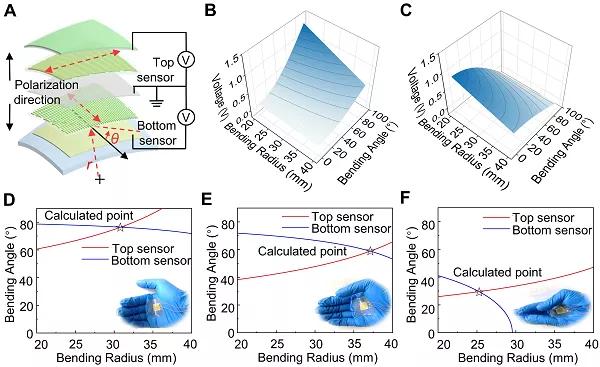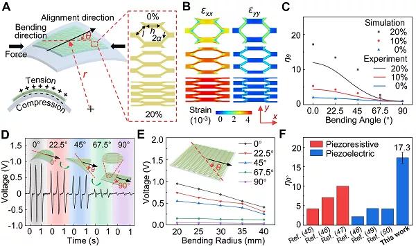 圖3. A 彎曲模式下壓電輸出示意圖。B 仿真應(yīng)變分布圖。C 仿真各向異性。D 不同彎曲方向的電壓輸出信號。E 不同彎曲方向和彎曲幅度的電壓輸出。F 多種各向異性傳感器的對比。