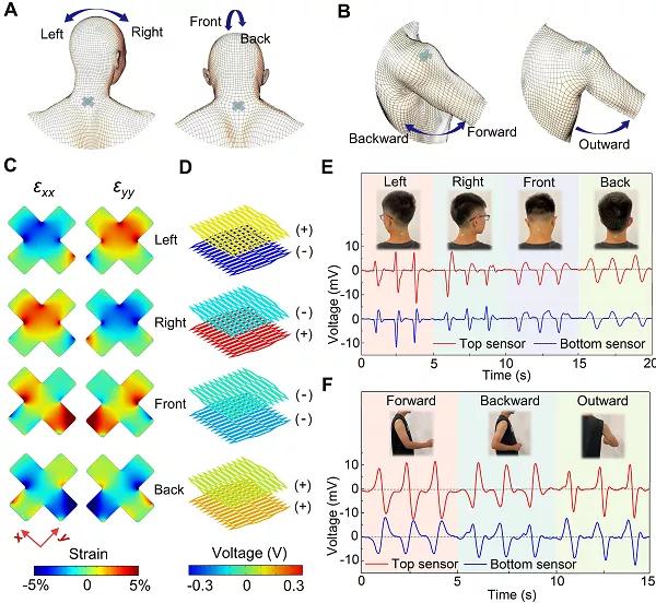 圖 5. A 頸椎運動模式示意圖。B 肩關(guān)節(jié)運動模式示意圖。C-D 仿真應(yīng)變和電壓分布。E 不同頸椎運動對應(yīng)的傳感器信號。F 不同肩關(guān)節(jié)運動對應(yīng)的傳感器信號。