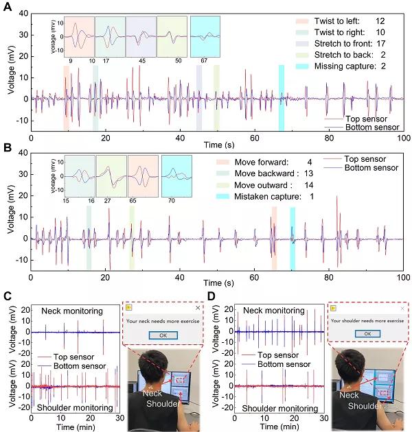 研究人員進一步將具有兩層壓電復(fù)合材料的傳感器貼到人的手掌上,便可通過分析上下兩層傳感器的壓電輸出,解耦得到手掌的彎曲幅度和彎曲方向(如圖4所示)。另一方面,當(dāng)這種傳感器被貼到頸椎和肩關(guān)節(jié)上時,上下兩層傳感器傳出的不同信號也能被用來分析頸椎和肩關(guān)節(jié)的運動模式,比如判斷頸椎是左右扭動還是前后擺動(如圖5所示)。在此基礎(chǔ)上,研究人員建立了一套關(guān)節(jié)運動監(jiān)測和警報系統(tǒng),在半個小時的監(jiān)測中,這套系統(tǒng)不光能判斷人體頸椎和肩關(guān)節(jié)的運動情況,而且還能根據(jù)不同情況對哪些部位缺乏運動進行警告,從而避免長時間久坐帶來的各種關(guān)鍵疾病(如圖6所示)。