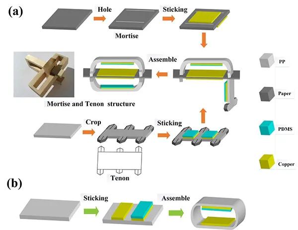 圖一、新型榫卯結(jié)構(gòu)摩擦納米發(fā)電機(MT-TENG)的制備流程