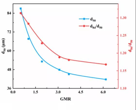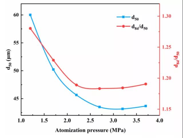 Lubanska研究了一種低熔點(diǎn)鐵合金的霧化工藝參數(shù)與粉末粒度之間的關(guān)系后總結(jié)出一個(gè)經(jīng)驗(yàn)公式: