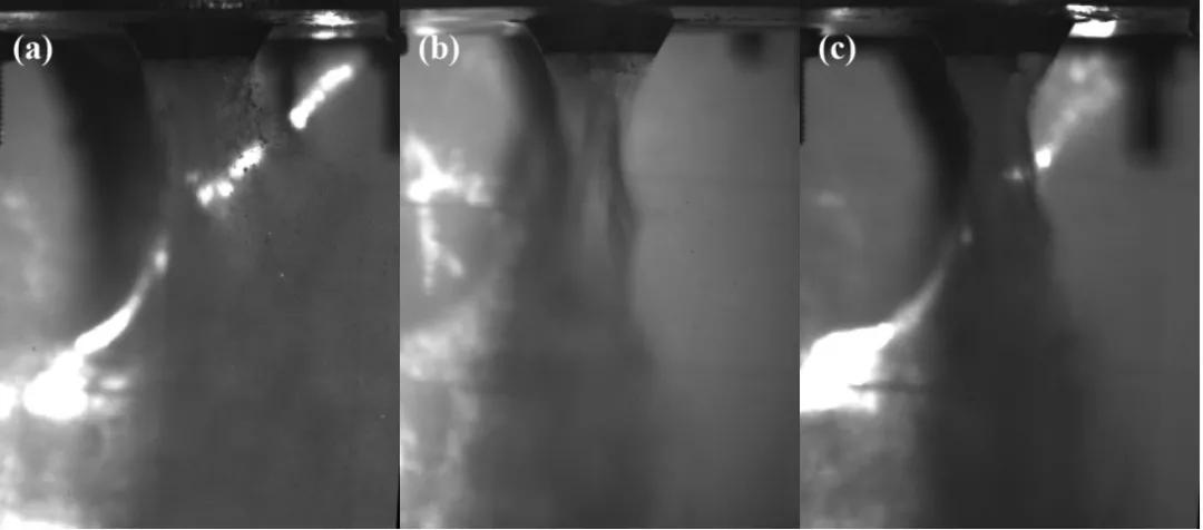 在霧化氣體壓力達(dá)到預(yù)定值并穩(wěn)定后, 形成的霧化流場也會(huì)變得穩(wěn)定, 液體破碎的機(jī)理和程度都不隨時(shí)間改變。如圖 5 所示, 為不同霧化氣體壓力下, 霧化流場穩(wěn)定后的圖像。圖 5 中的 (a)、(b)、 (c) 分別為霧化氣體壓力為 1.7MPa、 2.2MPa、2.7MPa 時(shí)的霧化流場圖像。