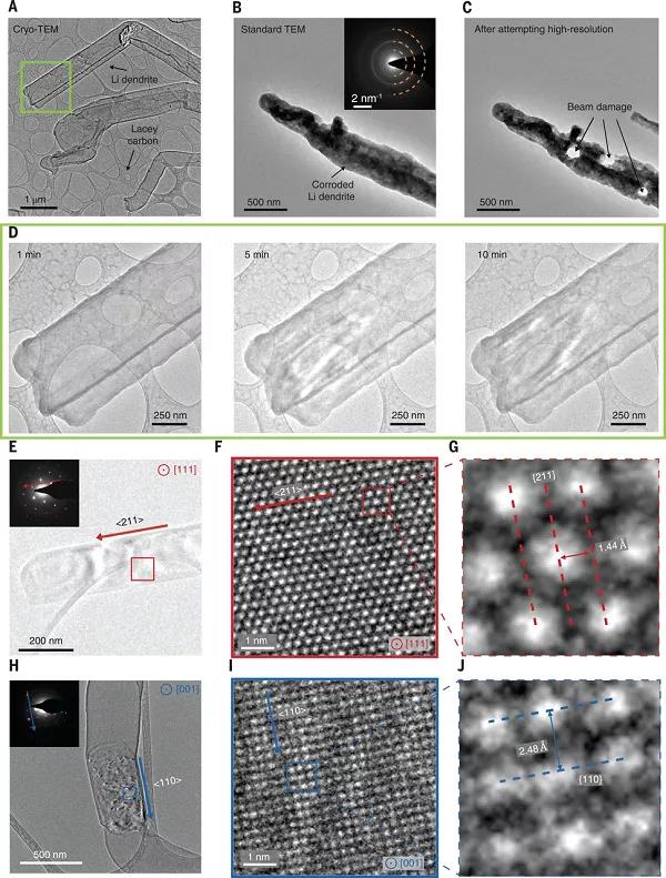低溫轉(zhuǎn)移過程中成功地保存了枝晶,與低溫轉(zhuǎn)移的樣品相反,在室溫下插入TEM中的Li金屬被迅速消耗掉(圖3B)。這些暴露在空氣中的Li枝晶的表面比低溫轉(zhuǎn)移的Li枝晶更粗糙,對比度也更暗,這是因?yàn)樾纬闪硕嗑蜗瘢x定區(qū)域電子衍射表明存在氫氧化鋰。此外,任何嘗用標(biāo)準(zhǔn)TEM在高分辨率下對鋰金屬枝晶成像的嘗試都會(huì)導(dǎo)致樣品破壞(圖3C)。在低溫條件下,在恒定電子束輻照下,即使在10分鐘后,也未檢測到枝晶形態(tài)的損壞。低溫下鋰枝晶的高分辨率圖像(圖3F,I)可分辨單個(gè)鋰原子,表明鋰枝晶是單晶的。