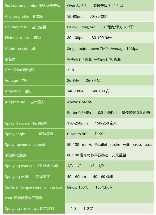 有關(guān)電弧熱噴涂參數(shù)表如下供施工方參考: