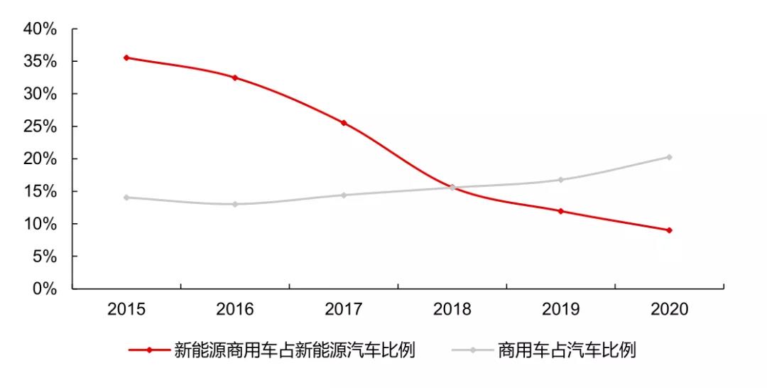 毋庸置疑,國內(nèi)汽車的電動(dòng)化成效顯著,銷量屢創(chuàng)新高,但是電動(dòng)車的增長主要來自乘用車,商用車幾乎沒有增長,尤其是中長途的重卡領(lǐng)域,電動(dòng)化進(jìn)展緩慢,甚至受阻。過去幾年,新能源商用車在新能源內(nèi)部滲透率不升反降,到了2020年新能源商用車的占比僅有9%。