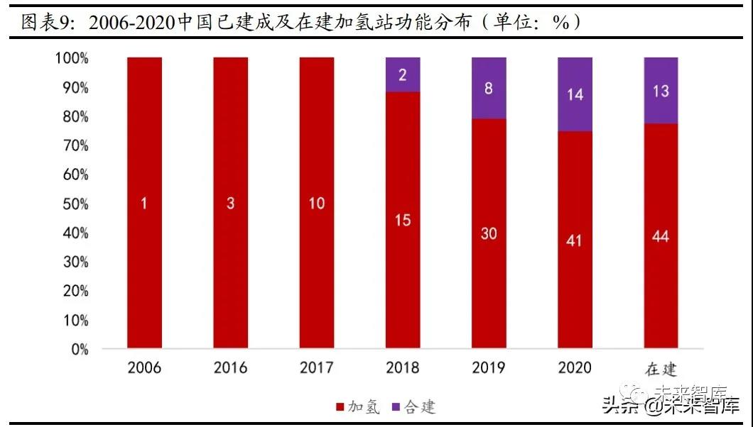 從加氫站的功能來看,國內(nèi)合建站占比逐年提高。根據(jù)《加氫站技術(shù)規(guī)范(國標 GB50516-2010)》,加氫站可以單站建設(shè), 但具有需要重新選址、投入成本高等弊端而 建設(shè)綜合加注站可以降低運營成本。國內(nèi)目前正積極探索“油、氫、氣、電”的聯(lián)合 建設(shè)運營模式,中石油、中石化等央企已開始進行相關(guān)的研發(fā)和建設(shè)。