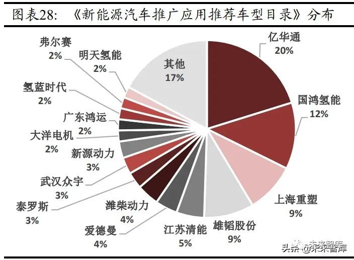配套車型居行列第一,市占率高龍頭地位穩(wěn)固:根據(jù) 19 年發(fā)布的《新能源汽車 推廣應用推薦車型目錄》,被納入目錄的燃料電池商用車型共 185 款,其中配套 公司生產(chǎn)發(fā)動機系統(tǒng)的商用車車型共計 37 款,占比高達 20%,超出第二名國鴻 氫能 8%。公司燃料電池發(fā)動機市場占有率穩(wěn)定在 20%左右,2019 年全國燃料電 池汽車銷量 2737 輛,同期億華通燃料電池發(fā)動機銷量 498 套,龍頭地位穩(wěn)固。