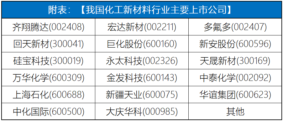 以化工新材料為例,“十三五”期間,行業(yè)得以快速發(fā)展,部分行業(yè)短板得到補(bǔ)足。當(dāng)前中國(guó)化工新材料市場(chǎng)呈現(xiàn)總體競(jìng)爭(zhēng)格局松弛與局部龍頭壟斷并行的局面,未來(lái)行業(yè)發(fā)展區(qū)域化趨勢(shì)仍將持續(xù)。當(dāng)前形成局部壟斷的化工新材料主要以大型國(guó)有企業(yè)為主,少量中石化集團(tuán)所屬的中小型國(guó)有企業(yè)表現(xiàn)不俗,數(shù)十家上市企業(yè)競(jìng)相發(fā)展(附上市公司清單)。這些企業(yè)因其進(jìn)入時(shí)間較早、積累了一定的行業(yè)經(jīng)驗(yàn)、形成完整的產(chǎn)業(yè)基礎(chǔ)、裝置、技術(shù)、人才儲(chǔ)備充分,同時(shí)也具有完整的產(chǎn)品鏈及管理規(guī)范。