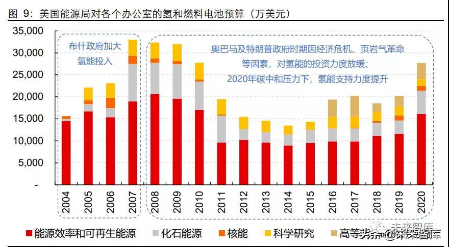 氫能的發(fā)展離不開(kāi)政府的財(cái)政支持,美國(guó)能源部主要通過(guò)“氫能規(guī)劃”(DOE Hydrogen Program)實(shí)現(xiàn)對(duì)氫和燃料電池技術(shù)的研究和應(yīng)用,規(guī)劃制定了從研發(fā)到產(chǎn)業(yè)化的計(jì)劃 路線(xiàn),跨越 2000~2040 年。2004-2020 年美國(guó)能源部對(duì)氫和燃料電池的預(yù)算支出金額 合計(jì)約 37 億美元,年均支出 2.2 億美元;其中 2008 年奧巴馬政府上臺(tái)后,受經(jīng)濟(jì)危機(jī) 和頁(yè)巖氣革命爆發(fā)影響,政府氫能預(yù)算支出減少;特朗普政府時(shí)期也更加重視傳統(tǒng)能源 的發(fā)展;而 2020 年美國(guó)新版國(guó)家氫能戰(zhàn)略發(fā)布及碳中和壓力下,氫能的預(yù)算支出同比 增加 37%至 2.77 億美元。