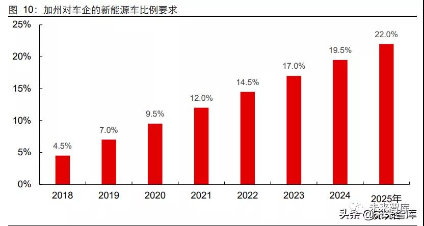 (2)政策法案:加州空氣資源委員會(huì)(CARB)于 1990 年首次采用 ZEV 法規(guī)(Zero Emission Vehicle,縮寫(xiě) ZEV),ZEV 目的是通過(guò)要求汽車(chē)制造商銷(xiāo)售一定數(shù)量的清潔 能源汽車(chē)來(lái)實(shí)現(xiàn)長(zhǎng)期減排目標(biāo),其中清潔能源汽車(chē)包括純電動(dòng)汽車(chē)、插電混合式汽車(chē)、 燃料電池汽車(chē)等;最新政策規(guī)定,該比例從 2018 年的 4.5%提升至 2025 年的 22.0%;不同車(chē)型對(duì)應(yīng)不同的積分,車(chē)輛在零排放的狀態(tài)下續(xù)航里程越長(zhǎng),可獲得的積分越高。2013 年 9 月,加州第 8 號(hào)議會(huì)法案(AB 8)審批通過(guò),該法案確立了空氣質(zhì)量補(bǔ)貼項(xiàng) 目、替代和可再生燃料及車(chē)輛技術(shù)項(xiàng)目等;同時(shí),還規(guī)定加州能源委員會(huì)每年投入 2000 萬(wàn)美元資金來(lái)支持至少 100 個(gè)加氫站的持續(xù)建設(shè);另外,該法案要求加州空氣資源委員 會(huì)每年針對(duì)燃料電池汽車(chē)部署和加氫站網(wǎng)絡(luò)發(fā)展做出年度報(bào)告。