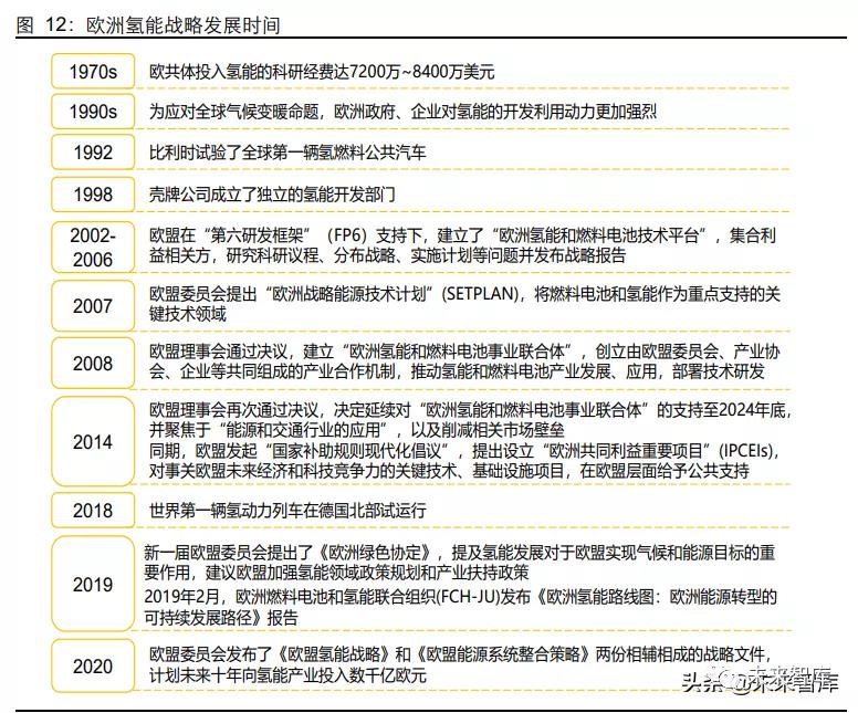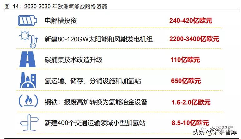 歐洲大力發(fā)展氫能的動(dòng)力,同樣來(lái)自全球石油危機(jī)后對(duì)能源安全的追求,及全球氣候變 暖背景下的降碳?jí)毫Α?020 年歐盟委員會(huì)發(fā)布了《歐盟氫能戰(zhàn)略》和《歐盟能源系統(tǒng)整 合策略》兩份相輔相成的戰(zhàn)略文件,計(jì)劃未來(lái)十年向氫能產(chǎn)業(yè)投入數(shù)千億歐元。從歐盟 的規(guī)劃可以看出,基于風(fēng)電和光伏等可再生能源的綠氫為其重點(diǎn)鼓勵(lì)和發(fā)展方向;氫能 戰(zhàn)略的投資計(jì)劃涵蓋制氫、儲(chǔ)運(yùn)氫、加氫的全產(chǎn)業(yè)鏈,以及碳捕集技術(shù)升級(jí)改造、氫能 煉鋼等,預(yù)計(jì)總投資規(guī)模約 3200-4600 億歐元。(報(bào)告來(lái)源:未來(lái)智庫(kù))