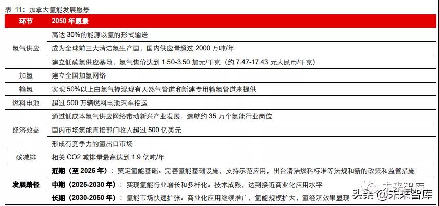 2020 年 12 月加拿大發(fā)布國(guó)家氫能戰(zhàn)略,目標(biāo)通過(guò)加強(qiáng)氫能基礎(chǔ)設(shè)施建設(shè)及促進(jìn)終端應(yīng) 用,降低氫能使用成本,降低國(guó)家碳排放量,同時(shí)成為全球主要?dú)淠芄?yīng)國(guó)。加拿大目 標(biāo)到 2050 年實(shí)現(xiàn)國(guó)內(nèi)氫供應(yīng)量超過(guò) 2000 萬(wàn)噸/年,氫氣售價(jià)降低至 1.50-3.50 加元/千 克(約 7.47-17.43 元人民幣/千克);建立全國(guó)加氫網(wǎng)絡(luò);實(shí)現(xiàn) 50%以上氫氣由現(xiàn)有天然 氣管道或新建專(zhuān)用儲(chǔ)氫管道提供;投運(yùn)超過(guò) 500 萬(wàn)輛燃料電池汽車(chē)。
