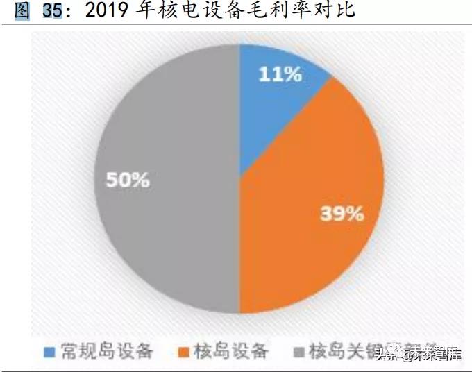 核島設(shè)備制造是核電國產(chǎn)化的核心,壟斷程度高,技術(shù)壁壘高,毛利率接近 40%。核電站建設(shè)成本占比最高,達到 64.3%,其中,核電設(shè)備 在核電站建設(shè)中所占成本最高,其比例高達 50%,而核電設(shè)備中核島成本 占比最高,達到 58%,因為核島工藝復雜,且安全性要求極高,核島中的 關(guān)鍵部件由于制造工藝要求高,制造所需資產(chǎn)均由國企壟斷。常規(guī)島與輔 助系統(tǒng)由于技術(shù)壁壘低,價格明顯下降,成本占比也相應下降,毛利率水 平僅為 10%左右。