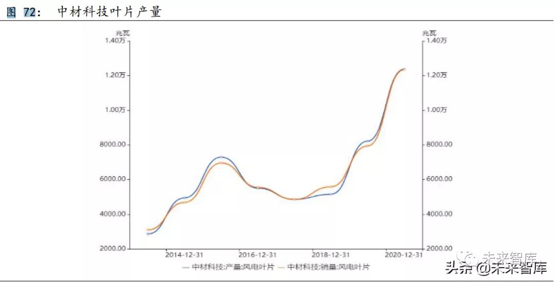 目前已上市的葉片生產(chǎn)頭部企業(yè)有中材科技和時代新材。中材科技 (002080.SZ)擁有江蘇阜寧、河北邯鄲、江西萍鄉(xiāng)、甘肅酒泉、吉林白 城、內(nèi)蒙古錫林及興安盟七大生產(chǎn)基地,兆瓦級葉片生產(chǎn)能力居全國首位, 成立至今全球銷售近 65GW,年產(chǎn)能超 4000 套,2020 年市場占有率全球排 名第一。2020 年中材科技(002080.SZ)風電葉片實現(xiàn)營業(yè)收入 89.77 億元, 同比增長 78.15%。公司風電葉片業(yè)務毛利率水平整體穩(wěn)定。