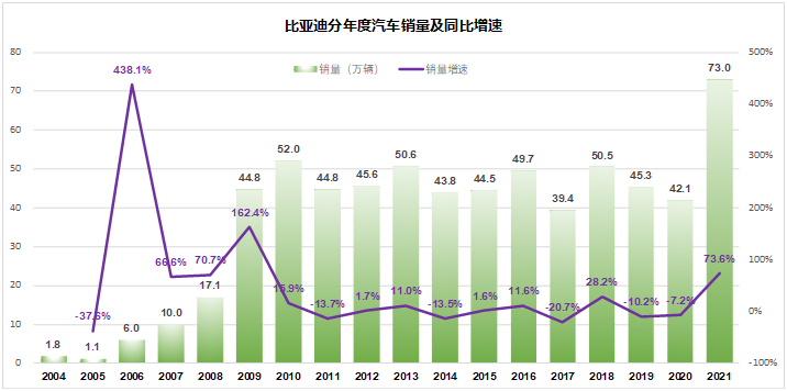 2010年之后,比亞迪就進(jìn)入瓶頸期,號(hào)稱“比3萬(wàn)”。每月3萬(wàn)多,每年四五十萬(wàn)的銷量,這種半死不活的狀態(tài)整整持續(xù)了10年,一直到2021年,比亞迪的年銷量才第一次超過(guò)2010年。