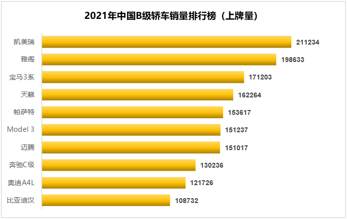 迄今為止,漢不僅僅是比亞迪最重要的一款車,也是中國(guó)自主品牌歷史上具有里程碑意義的一款車。2021年,按照工信部的上牌數(shù)據(jù),比亞迪漢以10.87萬(wàn)輛的上牌量,沖進(jìn)了中國(guó)B級(jí)轎車銷量排名榜的前十,排在這個(gè)榜單前面的,都是老牌的外資釘子戶,凱美瑞、雅閣,寶馬3……