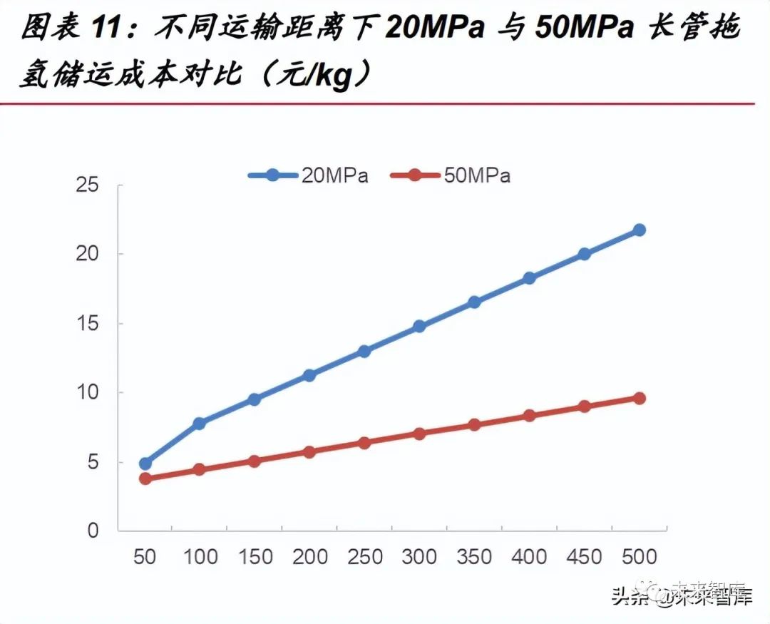 據(jù)中石油化工研究院數(shù)據(jù),當運輸距離為 50km 時,氫氣的運輸成本為 4.9 元/kg; 隨著運輸距離的增加,長管拖車運輸成本逐漸上升,當距離 500km 時運輸成本近 22 元/kg,所以考慮到經(jīng)濟性問題,長管拖車運氫一般適用于 200km 內的短距離和運量 較少的運輸場景。此外可以看出,隨著距離增加,20MPa 和 50MPa 運輸條件下的成 本逐漸分化,50MPa 下的成本優(yōu)勢越來越明顯,當運輸距離為 200km 時,其成本差 距約 4 元/kg。實際上,超過 200km 的運輸距離將導致拖車及人員配置冗雜的問題。