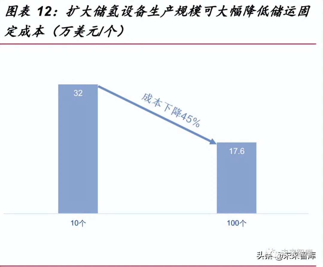 未來長管拖氫儲運成本下降的有效路徑是:一方面可通過提高儲氫壓力,實現(xiàn)儲 氫密度和運輸效率都更高的氫氣儲運方式;另一方面,未來氫氣氣態(tài)儲運成本下降的 有效路徑是擴大相關設備生產量。單位成本將在規(guī)模效應下逐步下降。據(jù) NREL (National Renewable Energy Laboratory)預測,當儲氫容器需求量從 10 增加到 100 個時,儲氫容器成本可下降約 45%。