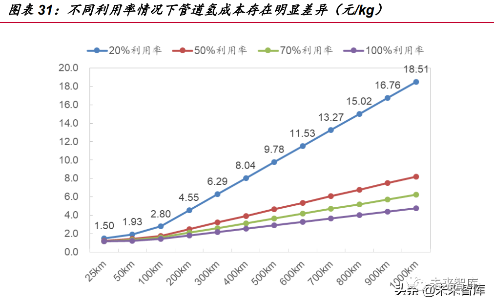 管道氫成本很大程度上受到需求端(利用率)的影響。在上述管道氫成本預測 中,我們假設管道運能的利用率達到 100%,在這種水平下,管道氫運輸成本表現(xiàn)出 非常低的水平,但隨著利用率水平的下降,管道氫成本陡然上升,當運能利用率僅為 20%時,管道運氫的成本已經(jīng)接近長管拖車運氫。在當前加氫站尚未普及、站點較為 分散的情況下,管道運氫的成本優(yōu)勢并不明顯。隨著氫能產業(yè)逐步發(fā)展,氫氣管網(wǎng)終 將成為低成本運氫方式的最佳選擇。