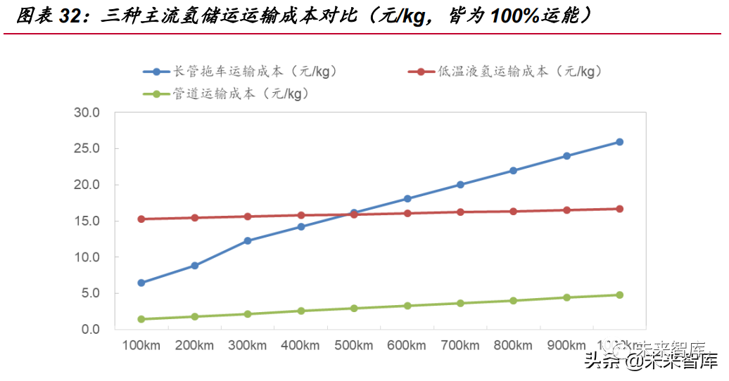 隨著大規(guī)模、長距離運氫需求的增加,低溫液氫輸送的優(yōu)勢將會顯現(xiàn),并成為中長 運距氫儲運的主流方式。從氫能發(fā)展更遠期來看,氫能產業(yè)發(fā)展將趨于成熟,用氫 需求將實現(xiàn)大規(guī)模化,且趨于穩(wěn)定,屆時管道輸氫綜合優(yōu)勢將成為長距離氫運輸最 佳選擇。