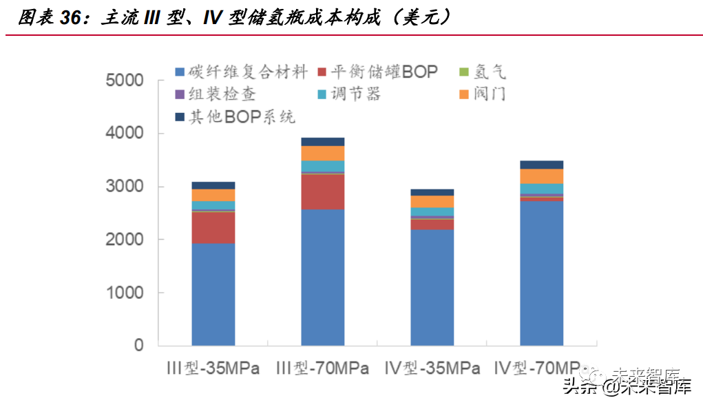 根據(jù)DOE及中科院寧波材料所測算,對于儲氫質量均為5.6kg的35MPa、70MPa 高壓儲氫 III 型、IV 型瓶成本組成來看,主要成本貢獻者是碳纖維復合材料,均占到 總成本的 70%左右水平。此外,當 III 型及 IV 型瓶儲氫壓力增至 70MPa 時,碳纖維 復合材料應用成本及比例大幅提升。因此降低碳纖維應用成本是儲氫瓶降本的關鍵。