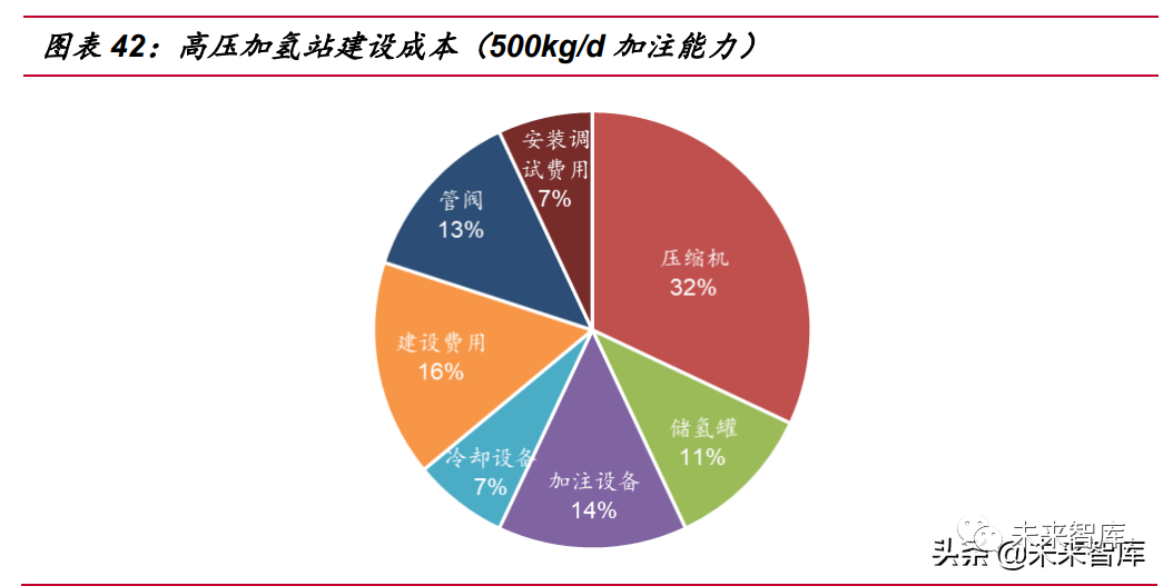 在當前以高壓氣態(tài)實現(xiàn)氫儲運的氫能發(fā)展初級階段,氫氣壓縮機是我國氫能儲運 所需的關鍵設備,當前國內大多數(shù)氫氣壓縮機主要依靠進口,投入及維護成本高,尤 其以加氫站所需壓縮機,以 500kg/d 加注能力加氫站建設為例,壓縮機成本占據(jù)加氫 站總成本的三分之一。