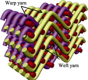 SiCf/SiC 復(fù)合材料的制造方法為有機(jī)前驅(qū)體浸漬熱解( Polymer Impregnation and Pyrolysis, PIP),其預(yù)制體編織方式為 2.5D 編織, SiC 纖維采用彎交淺聯(lián)方式編織,其結(jié)構(gòu)如圖 1 所示。預(yù)制體的緯向纖維束基本為平直纖維束,無(wú)任何擾動(dòng),而經(jīng)向纖維束以緯向纖維束為基軸,呈 S 形連續(xù)擾動(dòng)分布。預(yù)制體的尺寸約為 200 mm×150 mm×30 mm,編織好后采用CVD 法制備 PyC 界面層,然后利用主鏈含 Si 和 C 的有機(jī)前驅(qū)體溶液浸漬預(yù)制體,經(jīng)交聯(lián)固化成形后,高溫?zé)Y(jié)成 SiC 基體。復(fù)合材料拉伸試樣尺寸為 ?25 mm×5.5 mm, 試樣的拉伸方向平行于厚度( 5.5 mm) 方向。為了更好地考核涂層的結(jié)合性能,加工后的試樣5.5 mm方向平行于預(yù)制體的徑向, ?25 mm 的面平行于預(yù)制體的緯向。