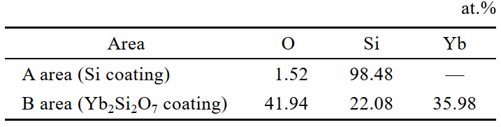 Si/Yb2Si2O7雙層涂層的結(jié)合強(qiáng)度( (26.23±3.13) MPa)略低于單層 Si 涂層的結(jié)合強(qiáng)度( (30.48±4.43) MPa)。分析原因是,從斷口形貌來(lái)說(shuō),雙層涂層在拉伸過(guò)程中,被拉開(kāi)的 SiCf/SiC 復(fù)合材料相對(duì)較少,且未發(fā)現(xiàn)粘結(jié)膠明顯被拉開(kāi), 從而使雙層涂層在拉伸過(guò)程中顯示的結(jié)合強(qiáng)度值降低。Yb2Si2O7 涂層的孔隙率約為5.2%,與 Si 層相比,孔隙等缺陷含量相對(duì)較高,這不利于涂層的結(jié)合強(qiáng)度, 且 Yb2Si2O7 涂層中含有一定的 Yb2O3 相。Yb2O3 的熱膨脹系數(shù)為 6.8×10–6~8.5×10–6 ℃ –1,與 Yb2Si2O7、 Si、 SiCf/SiC 的熱膨脹系數(shù)相差較大,會(huì)增加涂層的應(yīng)力,也可能降低涂層的結(jié)合強(qiáng)度。
