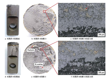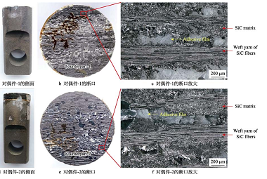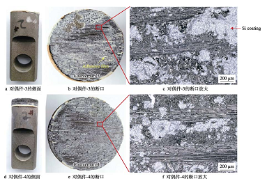 Si 涂層拉伸試驗(yàn)后的宏觀與斷面形貌如圖 10 所示。對(duì)偶件示。對(duì)偶件-3(見(jiàn)圖 10a)側(cè)面上方?jīng)]有明顯厚度的SiCf/SiC 復(fù)合材料或 Si 涂層,對(duì)偶件-4(見(jiàn)圖 10d)側(cè)面上方粘有試樣。從對(duì)偶件側(cè)面觀察可知,加有Si 涂層的復(fù)合材料在拉伸過(guò)程中, 斷裂位置主要在涂層或者涂層與復(fù)合材料的界面位置。在 2 個(gè)斷面的宏觀斷口(見(jiàn)圖 10b、 e)均可以看到條狀紋路和粘結(jié)膠,由于粘有 Si 涂層,粘結(jié)膠的顏色較淺。在斷口放大形貌(見(jiàn)圖 10c、 f)觀察到 Si 層、大量絲狀緯向 SiC 纖維和灰黑色 SiC 基體。以上觀察結(jié)果表明,含 Si 層的 SiCf/SiC 復(fù)材在拉伸過(guò)程中,部分 Si 層、復(fù)材的 SiC 基體、粘結(jié)膠都發(fā)生了斷裂,且復(fù)材表面部分緯向的 SiC 纖維沿拉伸方向被拉開(kāi)。