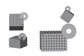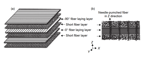 新型的 2.5 維或者 3 維 C/SiC 復合材料如圖 2所示,C/SiC 復合材料除 X、Y 方向上層層垂直疊加的排布及短小纖維層外,層與層之間多出 Z 方向上 0.5 維或者 1 維的針刺碳纖維材料,增強了纖維材料層與層之間的聯(lián)結性能,并且多出的 0.5 維或1 維的針刺碳纖維材料使材料的各項性能都有了一定的提升,對材料在加工或者使用過程中的分層缺陷起到一定的抑制作用。2.5 維和 3 維 C/SiC 復合材料相較于 2 維 C/SiC 復合材料,具有更高的層間剪切強度、更好的撓性等,但其制備難度和去除加工難度也高于 2 維 C/SiC 復合材料。