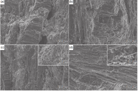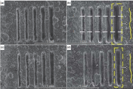 圖 15 不同功率及掃描速下飛秒激光燒蝕 C/SiC 復合材料的 SEM 圖 (a),(c)0.5 W;(b),(d)1 W(速率從左到右為:1.5 mm/s、1.2 mm/s、0.9 mm/s、0.6 mm/s、0.3 mm/s)